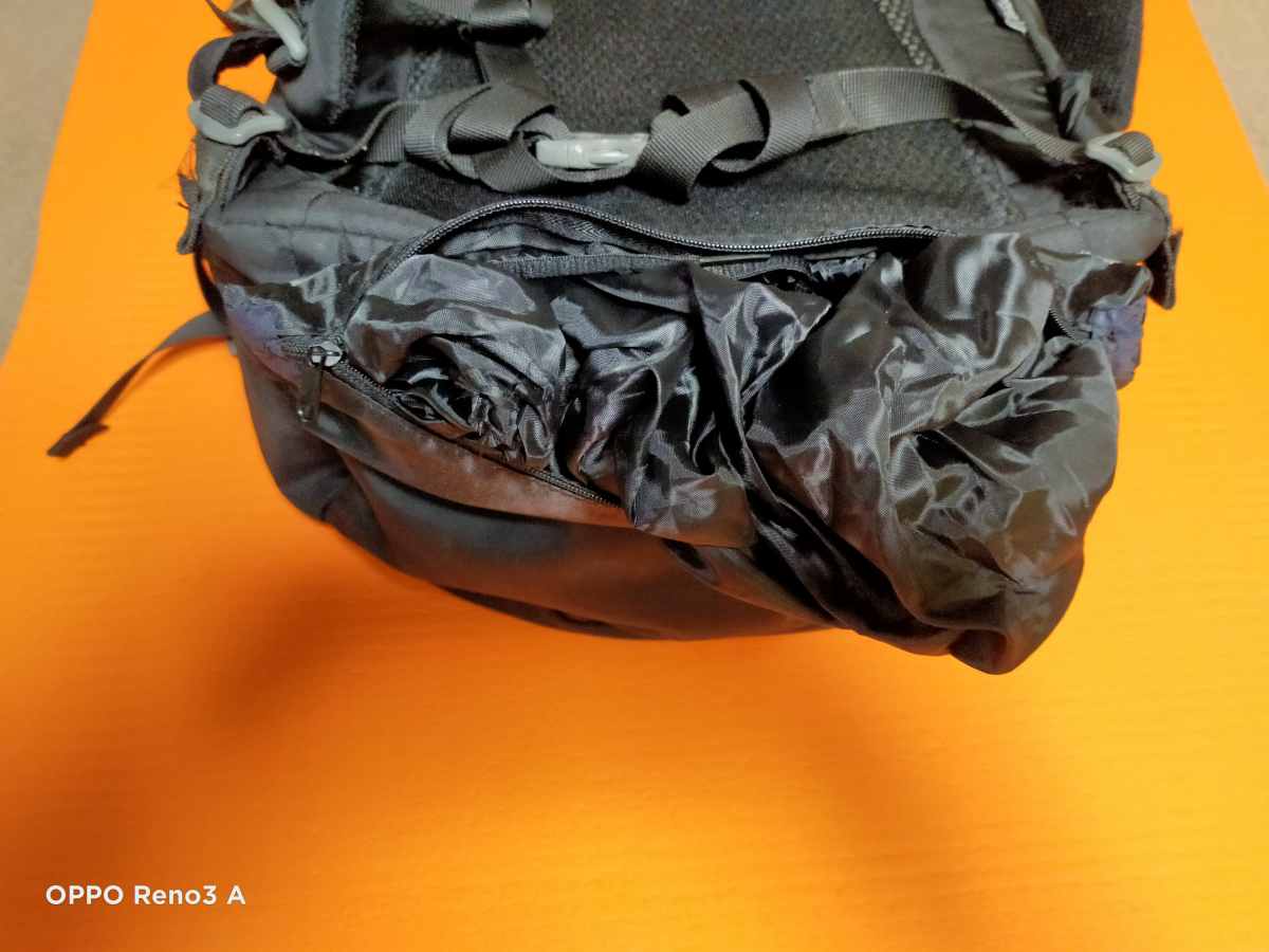 山用のザックでよくあるように、ザックの底に普段から取り付けておけると便利なので、つけてみました。以前、河口湖マラソンの参加賞でもらったワンショルダーのバッグで使ってないのがあったので、そのファスナー周りを切り出して、レインカバーを入れました。完全に入れた状態と、少しレインカバーを引き出した状態が次の通り。