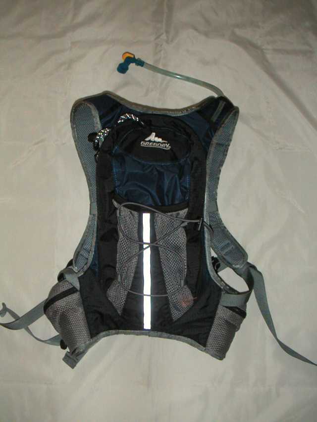水分補給用はこのテレインで3時間の場合、自動販売機をあてにするという手もあります。しかし、いつでも水分を取れるようにするためと、熊除け鈴などの小物を出し手入れしやすいようにしたいので、ハイドレーションザックを使いました。昨年も使ったものですが、Gregory Stimulus というモデルです。腰ベルトの部分にポケットがあり、そこが気に入ってます。