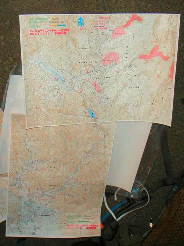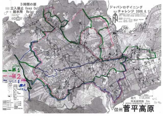 参加者は12時間クラスが多く、3時間のクラスは41人でした。12時間が土曜日の夜10時スタートで、夜を徹してのレースが終盤にかかる、日曜の朝8時が3時間クラスのスタートでした。12時間クラスは作戦タイムが長いので、参加者は道路や白樺荘内外にべたっとなって計画していました。地図は写真のとおり上田の付近まで入っているので、なかなか大変そうでした。こちらは冷やかしなので、気楽にみてましたが、ここは直進でショートカットだなんて結構無茶としか思えないことを言っているチームもいました。本当にあそこをショートカットしたのでしょうか。