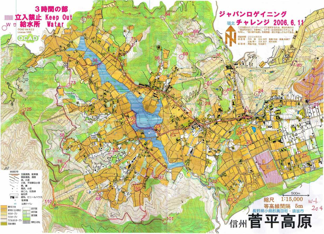 したチームが直前に通過しました。そして本格的な畑の中の急斜面の道路から、笹やぶに入って直登し、小径に。このあたりは羊歯の林でした。尾根上の鉄塔に到着すると違う方向から12時間のチームが来て、すれ違い。まだまだ元気そうでした。101は直前の300mくらい小径が消えて笹薮の直進でした。風の音か工事のような音がする。こんな所で会わないよなとは考えるものの、しまっていた熊よけ鈴を外にぶらさげました。そして鈴を鳴らしながらの、薮の直進で時間もかかり、101で1時間。予想以上に時間がかかっています。次の110には逆戻りし、途中まで道を下って行くと、尾根につながっていそうな手頃な分岐が現れたので、その道に入りました。途中で道は消えたものの、それほど苦労せずにスキー場のオープンに到着。急斜面を登ってピークに到着すると、ひとり110のポイントから脱出するところでした。こちらも追っかけて110をゲット。後でLAP表をみた所、最初に同じ方向に向かった入間のM氏と判りました。次の125までは単純でしたが、101と同様ポイント直前は笹薮の直進でした。戻ってくだり、沢の奥から道を下るが全然76が現れない、結局地図の標記よりかなり下で発見。この後、48、53と取り、少し登り返して58の予定だったが、どうみても時間不足。予定を変更して58に直行。さらに73、38と取り、湿原対岸の道路に出たところでもう一度時間と距離を確認、30分弱あって、75まで往復してもゴールまで4km程度、75は探し回る心配もなさそうなので、75を取りに行きました。後はひたすら走り、身体が重くてきつかったですが、スピードを出し過ぎずに走り続けました。昨年みたいにバス通りの登りで脚がつったら遅刻でしたが、ぎりぎりで制限時間に間に合いました。