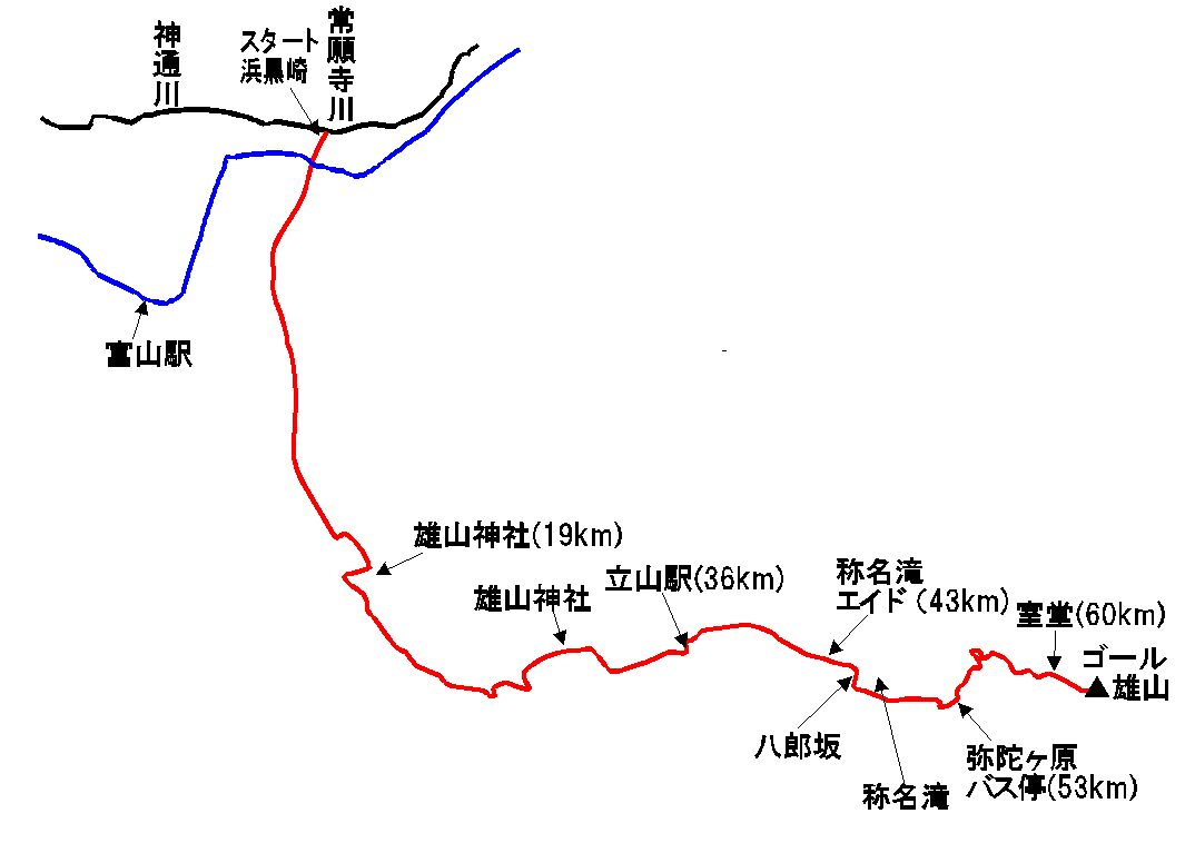 雄山神社までは、川の土手の道を走る。昨年は眠くてしようがなかったが、今年は金曜日を休んで来て、早く眠ったので問題なし。