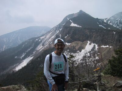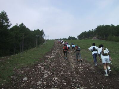 いよいよスタート、いきなりスキー場の急斜面できつい。女性も何人もいるが、さすが体力あるようだ、小柄でもぐいぐい登っていく。しかし、急だ。とても走り続けられなくて、歩く。延々と登り、 上級ゲレンデの一番上まで登り、やっと少しなだらかになる。そして林道を横切り、いよいよ登山道。すこし行くと、残雪がでてきた。 道に盛り上がるように残っているので、横にずるっと滑ってしまい