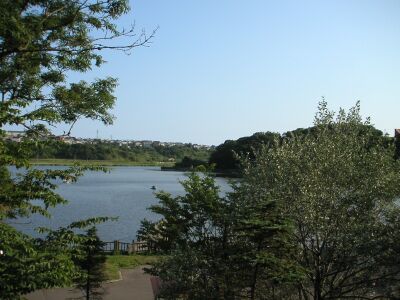![]() 博物館から見た春採湖と海 |